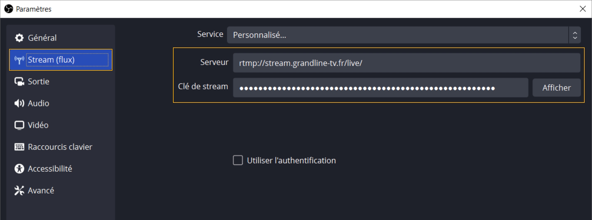 Dans les Paramètres de votre diffusion, dans l'onglet "Stream (flux)", vous trouverez les champs "Serveur" et "Clé de stream".